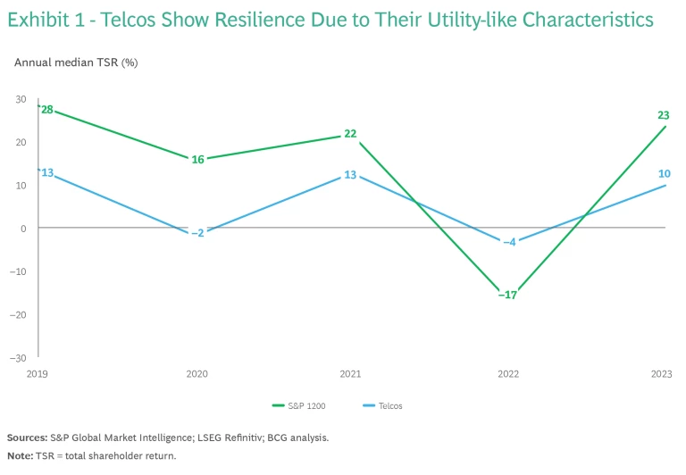 Telcos’ utility-like characteristics translate into relatively stable returns. As a result, in years (such as 2023) when cross-market returns are strong, telco returns fall short of the average, but in challenging years (such as 2022) they outperform most other sectors. (See Exhibit 1.)