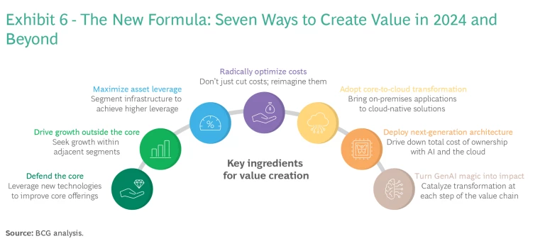 The strategies discussed above show how innovative managers have generated value over the past five years. But new thinking will be needed for creating value over the next five years. In pursuing a formula for success, we have identified seven key ingredients that telcos must deploy to achieve optimal results. (See Exhibit 6.)