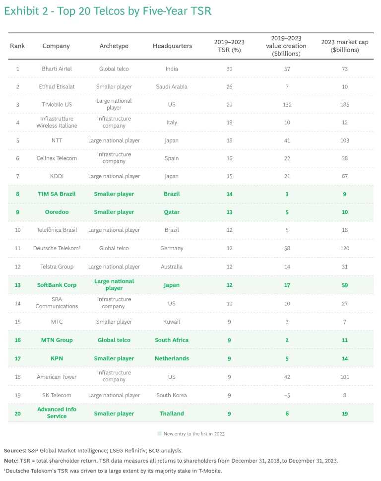 We analyzed 59 public companies in the telco sector globally on the basis of their annualized TSR, measured over five years to limit the impact of short-term market moves. Because of the large time interval involved, changes in rankings are gradual; 70% of the top 20 companies, as ranked by TSR, secured places in last year’s top 20 rankings as well. (See Exhibit 2.)