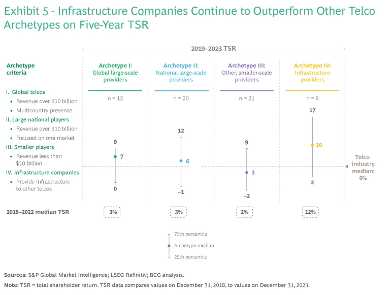 Infrastructure companies have strong returns but confront unique challenges. These companies manage infrastructure for other carriers. The six infrastructure companies in our sample had a median annualized five-year TSR of 10%. (See Exhibit 5.) This is the highest of the four archetypes but down from 12% in 2022. Because these companies are typically highly leveraged, with a 5x to 7x multiple of net debt to EBITDA, consistently high interest rates have depressed their returns during the past two years. They are also feeling the effects of their telco customers’ slowed investment, which peaked in 2022.