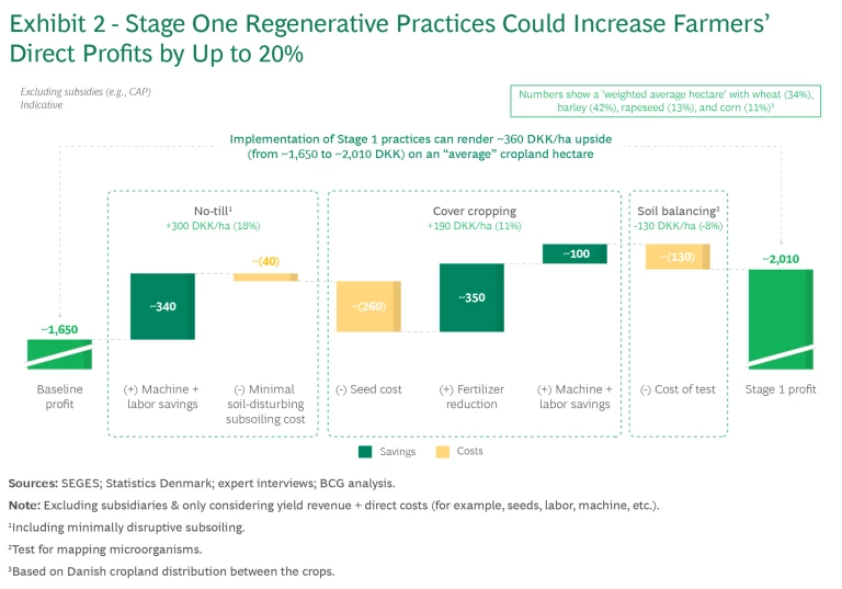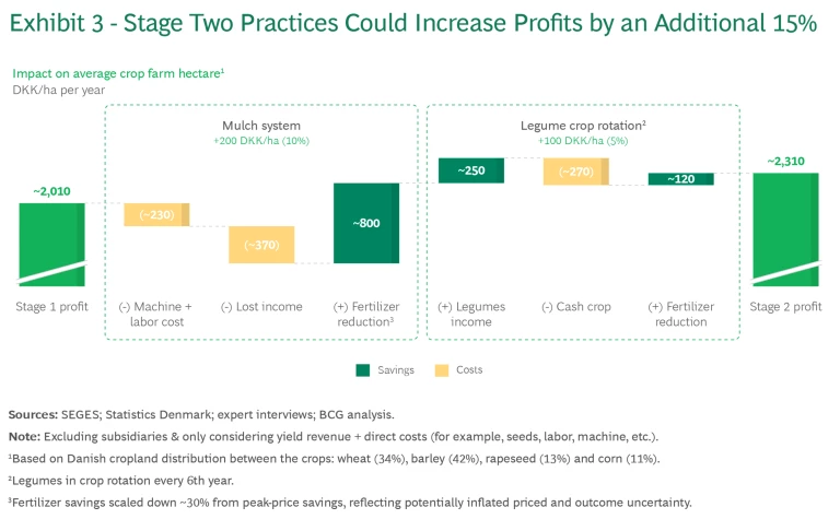Stage two or intermediate practices, notably mulching and legume crop rotation, would increase the contribution margin by an additional 300 DKK, thanks primarily to lower fertilizer costs. (See Exhibit 3.)