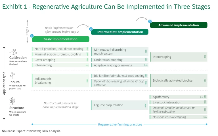The essential regenerative agriculture practices can be implemented in three stages—basic, intermediate, and advanced—over the course of several years. Most stages include three kinds of activities affecting how the soil and crops are cultivated, what inputs are used, and how the land is structured. (See Exhibit 1.)