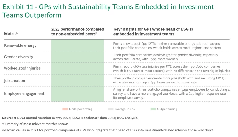 Because GPs with sustainability teams embedded into investment teams spend more time engaging directly with portfolio companies, it’s not surprising that portfolio companies at these GPs systematically deliver stronger outcomes across the EDCI metrics. For example, they reported 2 percentage point higher median rates of renewable energy usage and 50% less work-related injuries, on average, in 2023. (See Exhibit 11.) This in turn ultimately leads to commercial value creation in the form of reduced energy costs, reduced employee costs, and a more diverse leadership group pushing company agendas forward.