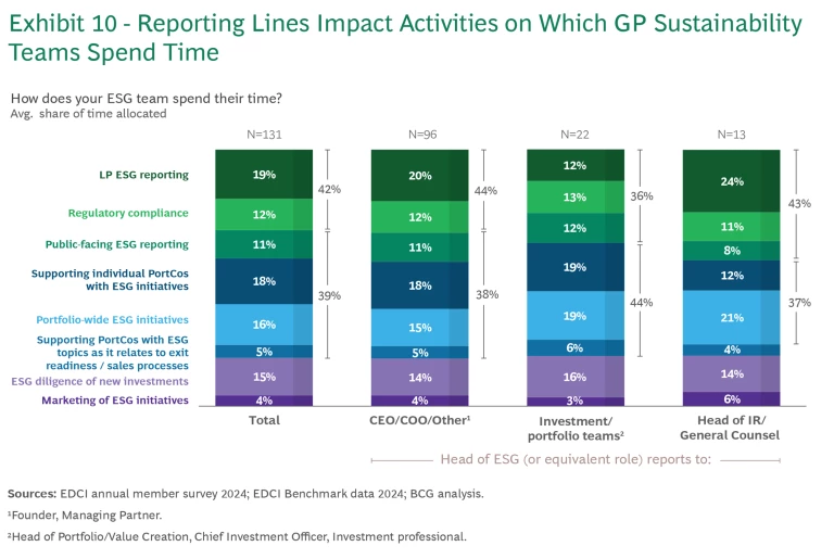These differing reporting lines appear to have a considerable impact on how sustainability teams spend their time. Sustainability teams whose heads report directly to investment professionals spend 36% of their time on sustainability reporting and regulatory compliance, compared to 44% when they report to the CEO. And these teams spend 44% of their time directly supporting portfolio companies with sustainability issues, compared to 38% when they report elsewhere. (See Exhibit 10.)