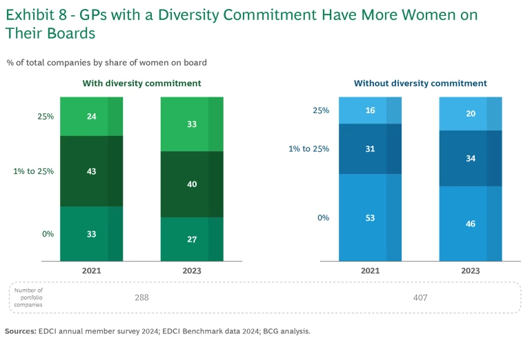 Further evidence of the impact of public diversity commitments can be seen in how the share of women on boards has improved over time. For example, consider portfolio companies with over 25% women on their boards. At GPs with diversity commitments, the proportion of these companies increased from 24% in 2021 to 33% in 2023. The number of these companies at GPs without diversity commitments increased only half as much—from 16% to 20%. (See Exhibit 8.)