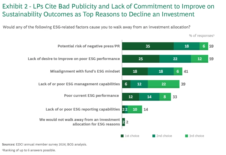 Despite this, LPs are clearly willing to act on sustainability considerations. An overwhelming 98% of LPs say they would walk away from an investment if the manager was not adequately committed to sustainability. The primary reason cited was the risk of negative publicity, which highlights the level of concern LPs have about how their investment activities may be perceived—but also shows that they understand just how important sustainability issues have become. (See Exhibit 2.)