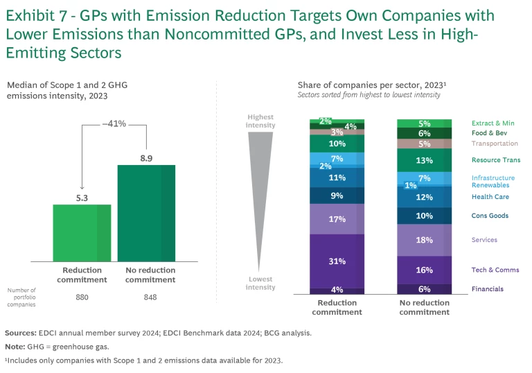 It should be noted, however, that GPs with public firm-wide commitments to emissions reductions tend to invest predominantly in relatively lower-emitting industries. For example, they are almost twice as likely to invest in the Technology and Communications sector, the second lowest emitting sector after Financials. In contrast, the average share of portfolio companies in the top-five highest emitting sectors—Extractives and Minerals Processing, Food and Beverage, Transportation, Resource Transformation, and Infrastructure—at GPs without public firm-wide commitments is 37%, compared to just 26% at those with commitments. (See Exhibit 7.) Given the urgency of addressing climate change, it’s critical that more GPs with higher exposure to heavy-emitting assets also establish equivalent emissions targets and that those with public commitments step up and lean into the challenge of transforming heavy emitters.