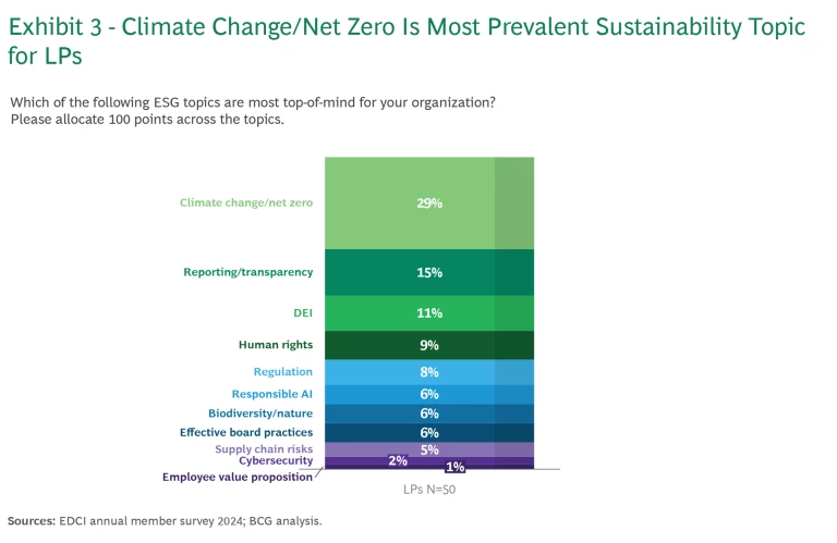 LPs currently vary on the sustainability issues that matter to them most. Unsurprisingly, they attributed the greatest weight to the climate change/net zero topic. (See Exhibit 3.) The second most important topic was reporting and transparency, a concern that does not bear directly on improving sustainability but rather on the ability for LPs to track their investments’ commitment to and progress on sustainability issues. Other direct sustainability issues, such as diversity, equity, and inclusion (DEI) and board practices, while still important, were less top-of-mind.