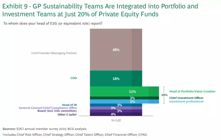 Within private equity, there is no one-size-fits-all approach to how sustainability teams are, or should be, structured. Three-quarters of the GPs we surveyed devote fewer than three full-time staff members to sustainability, a figure largely dependent on the size of the fund. At nearly half of them, the head of the sustainability team reports directly to the CEO, while just 20% of sustainability teams are integrated directly into portfolio and investment teams, reporting to either the chief investment officer, the head of portfolio and value creation, or other investment professionals. (See Exhibit 9.)