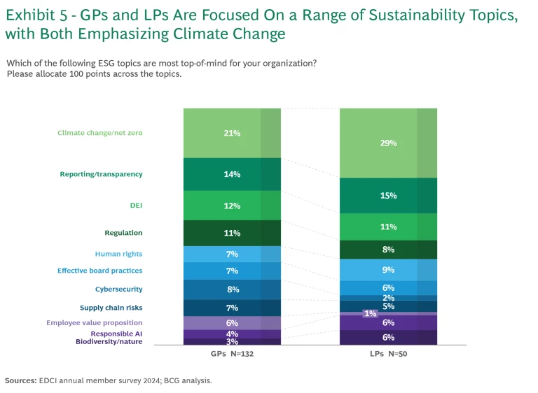 Still, it is important to clarify what prioritizing sustainability actually means. LPs have long valued better reporting and disclosure, but how much are they measuring and rewarding improvements in sustainability outcomes? And given their interest in sustainability, are LPs directing capital towards specific sustainability goals such as climate change?