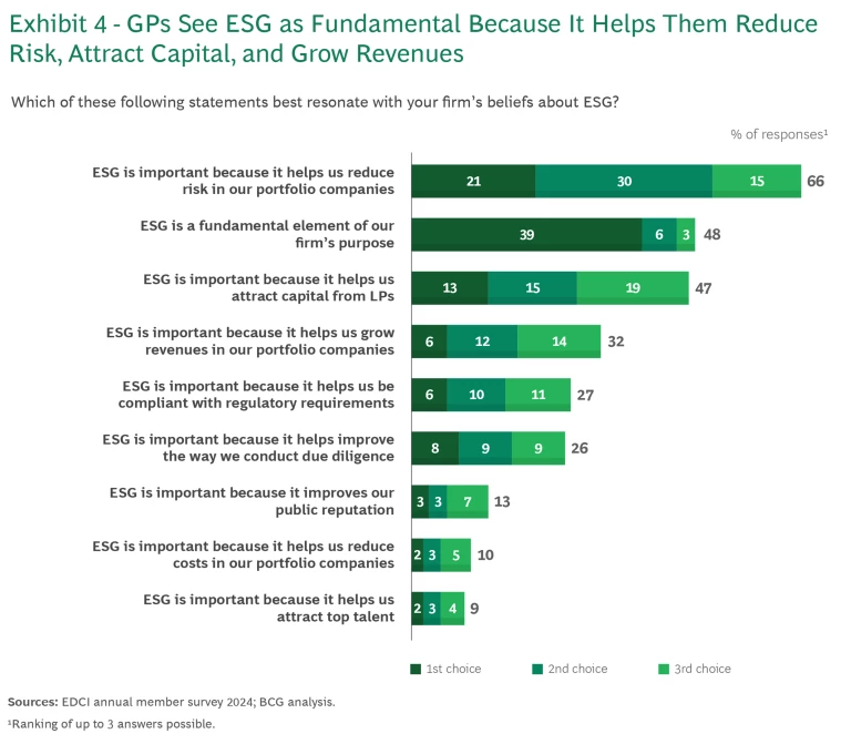 Many of the GPs we surveyed are committed to sustainability, with half of respondents saying it is fundamental to their firm’s purpose. (See Exhibit 4.) An even larger proportion—two-thirds—said sustainability is important because it helps reduce risk in their portfolio companies. Helping attract capital from LPs and boosting their portfolio companies’ revenues were cited significantly more frequently than historically important drivers of sustainability activities such as regulation or compliance, further supporting the belief that sustainability efforts are important for overall value creation and capital formation.