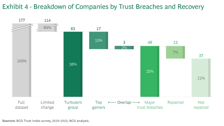 - Once lost, trust is hard to regain. Recovery takes much longer than some company leaders may expect. Only 2% of the companies BCG studied experienced a rebounding trust-creating event in the quarter after a trust breach. Just 12 companies recovered from a major trust decline and sustained that recovery through the end of the three-year period.