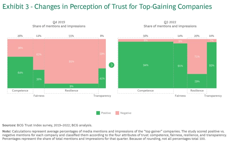 In short, these companies focus on doing what they already do well—and on doing it even better and then drawing attention to it. Our study, and the Trust Index research that preceded it, underscore how crucial competence-demonstrating actions are to building trust. We saw this in the discussions that we analyzed: positive comments tended to focus on competence, while negative comments focused on fairness, resilience, and transparency. Among the top gainers, 82% saw a significant uptick (more than 20 percentage points) in the relative share of positive discussion about their competence, compared with only 6% of the nongainers.