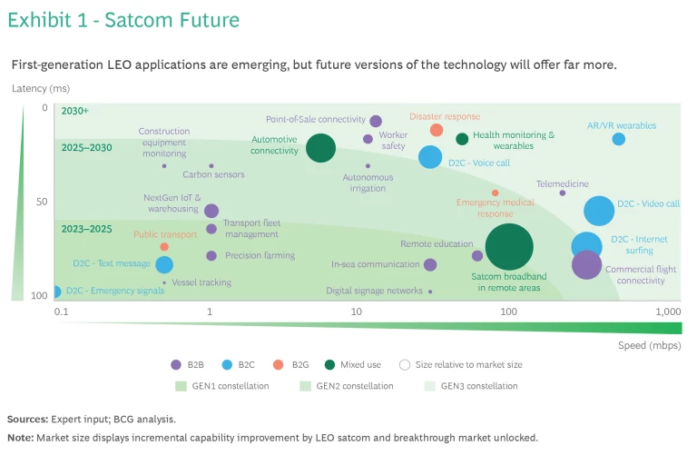 The global satellite communications market is on track to reach $40 billion to $45 billion by 2030, according to our analysis, up from roughly $25 billion right now. LEOs are expected to contribute roughly 40% of the market at that point, primarily because they offer features that existing satellites do not. Until recently, most satellites’ usefulness has been limited by geostationary orbit (GEO) high above the Earth, offering slow, low-bandwidth connectivity for a small number of applications.