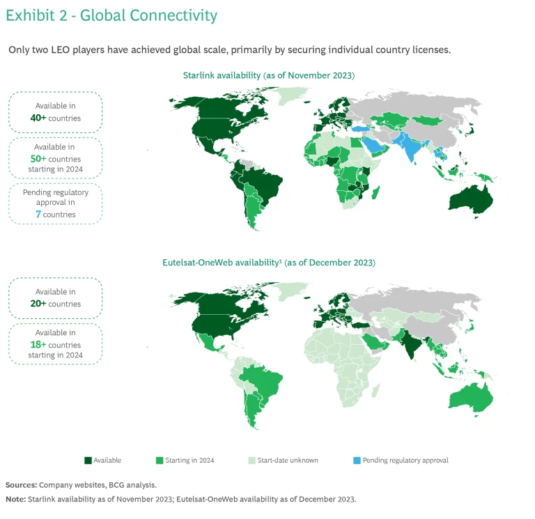 That complexity is a key reason why only two LEO players—Starlink and Eutelsat-OneWeb—have managed to achieve global scale. Both have signed memoranda of understanding with nations and alliances, including the European Union. Even with those agreements in place, some countries are wary of granting operating licenses due to concerns over sovereignty and cybersecurity. As of the end of 2023, Starlink service was only available in about 40 countries, and Eutelsat-OneWeb in about half as many, though more countries are scheduled to start offering it in 2024. (See Exhibit 2.)