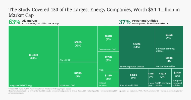 To determine the sample for our 2024 energy company TSR analysis, we began with a list of all publicly traded energy companies across all regions and subsectors. We applied several criteria to filter the list and arrive at the final sample. The 150 companies included in the final sample had a market capitalization exceeding $7 billion, traded at least 20% of their shares in public capital markets, and were publicly listed for the full five-year period of 2019 through 2023. Chinese- and Russian-listed companies are excluded. The total market cap of the sample is nearly $5.1 trillion. (See the exhibit “The Study Covered 150 of the Largest Energy Companies, Worth $5.1 Trillion in Market Cap.”)