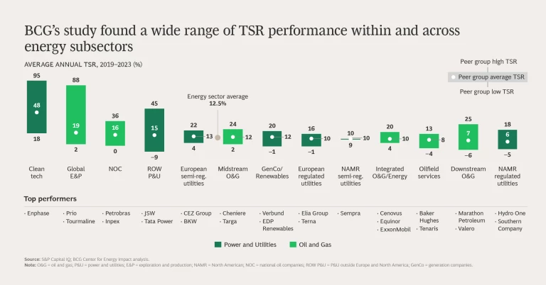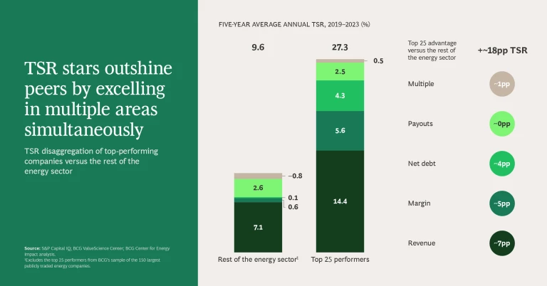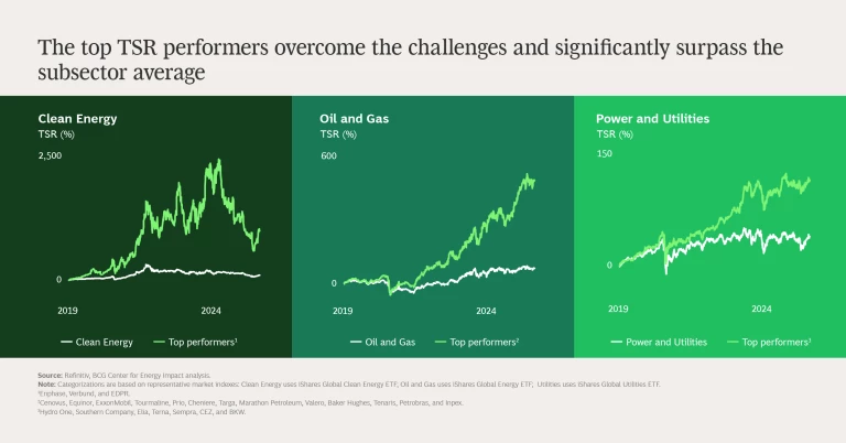 In the energy sector, the ability to deliver superior shareholder value during the energy transition has become a true litmus test for strategic excellence, outstanding execution, and resilience. BCG’s analysis of total shareholder return (TSR) in the energy sector from 2019 through 2023 reveals significant performance differences. Across energy subsectors, the average annual returns range from 48% to 6%. Within subsectors, we found a 30% gap, on average, between the top- and bottom-performing companies. Top performers consistently created more value than their direct peers in the same macroeconomic context. (See “About the Study.”)