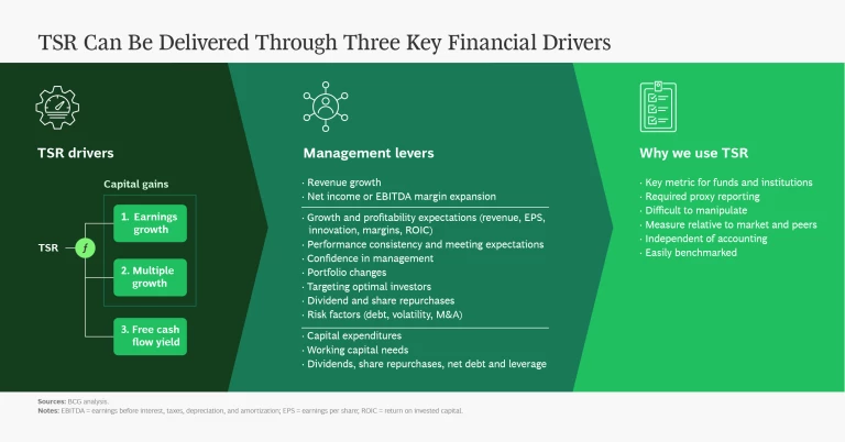 BCG’s approach deconstructs TSR into several underlying drivers. (See the exhibit “TSR Can Be Delivered Through Three Key Financial Drivers.”) We use a combination of revenue growth and margin change to assess changes in fundamental value. We then factor in the change in a company’s valuation multiple to determine the impact of investor expectations. Together, these two factors determine the change in a company’s market capitalization and investors’ capital gain (or loss). Finally, we track the distribution of free cash flow to investors and debt holders in the form of dividends, share repurchases, and repayments of debt to determine the contribution of free cash flow payouts to a company’s TSR.