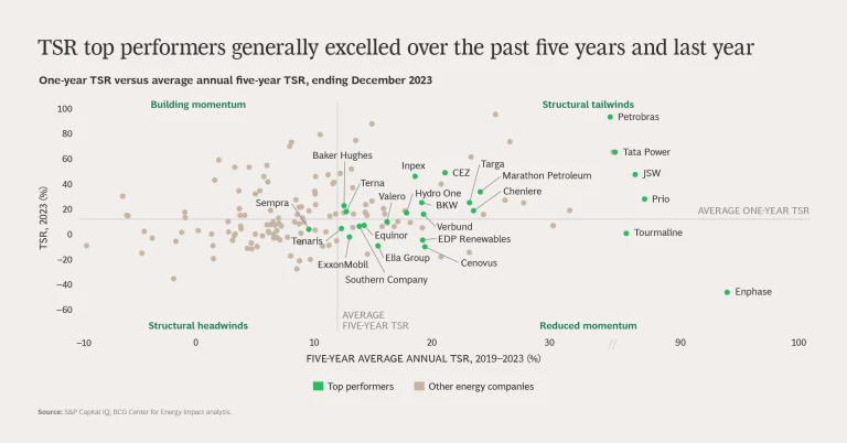 We determined the TSR top performers by selecting companies in each peer group with the highest five-year annualized TSR. To ensure comprehensive representation, we selected three companies from the integrated O&G peer group (the largest sector, representing approximately 30% of the energy sector’s market cap); the top two companies from ten peer groups; and the top company from clean tech and North American semi-regulated utilities (the smallest peer groups, with fewer than five companies each).