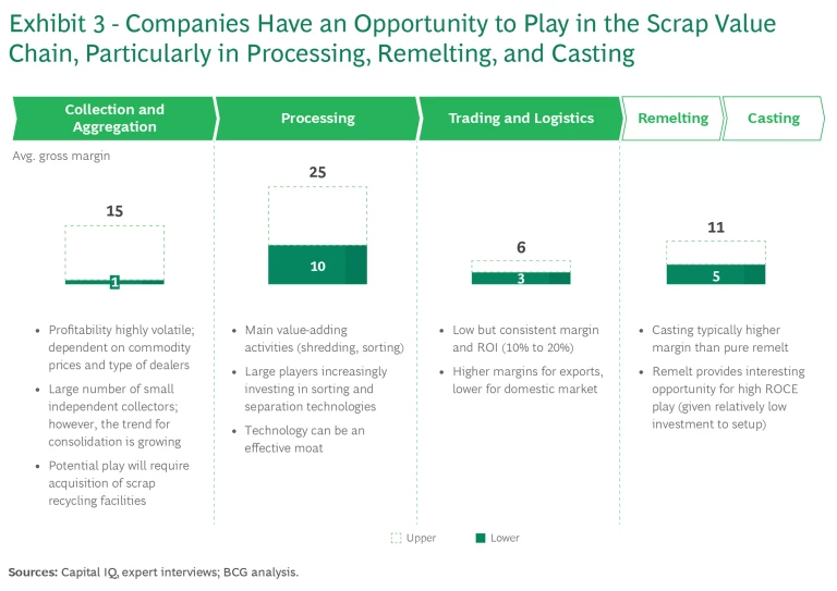 While recycling partly addresses the industry’s problems, companies will have to solve the problem of limited scrap availability worldwide. They will also need to identify attractive opportunities within the scrap value chain to make setting up the infrastructure worthwhile. We’ve found that value creation differs widely depending on the activity. Scrap processing (with average gross margins of 10% to 25%) and remelting and casting (with margins of 5% to 11%) are the most attractive from a margin perspective. (See Exhibit 3.) To compete effectively in scrap processing, players will need to invest in advanced sorting technologies. In the remelting and casting segments, casting offers players higher profit margins, but remelting can provide good returns on capital employed because of the low investment requirements.