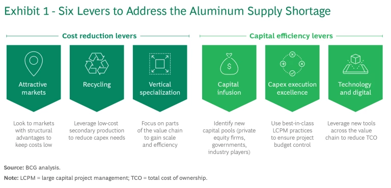 Faced with these huge challenges, we believe the industry must consider more radical action steps to achieve future success. (See “The Future of Process Industries.”) These fall into two broad categories: The first involves cost reduction levers, while the second involves raising capital and deploying it more effectively. In this article, we explore six actions across both categories that can help aluminum players navigate the industry’s supply shortage. (See Exhibit 1.)