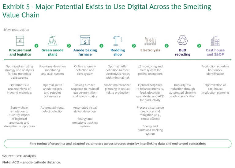 Aluminum companies can tap digital tools to help manage the total cost of ownership of their facilities. Advances in technology, such as generative AI, open up opportunities for companies across the value chain. Examples include systems that monitor production lines for process deviations in real time and then alert managers, as well as automated visual defect detection systems. Within smelting, digital can deliver efficiencies and strengthen supply chains in procurement and logistics, and can track energy usage and emissions during the electrolysis process. (See Exhibit 5.) We estimate that by using these tools, companies can reduce the cost of smelted aluminum by $20 to $30 per ton, helping to free up resources to meet capacity demands.