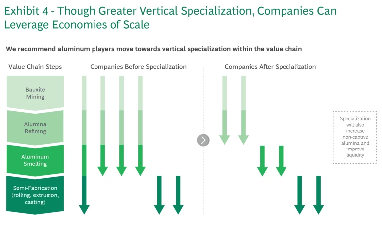 As a moonshot action, the aluminum sector can also reinvent itself through vertical specialization. By disassembling the value chain and specializing, companies can unlock capital and improve efficiencies. The activities of most aluminum companies, especially outside China, are spread broadly across the value chain. This has resulted in fragmentation and lack of scale. As a remedy, companies could specialize in discrete parts of the chain, whether that’s mining and refining or smelting. There is precedent to doing so from other industries; chemical companies have increasingly targeted specific parts of the value chain to create strategic focus and improve performance. In recent decades, for example, large chemical players have split out their petrochemical, commodity, and specialty chemical businesses. This has enabled them to specialize in one or two areas, while forming joint ventures to source raw materials where needed.
