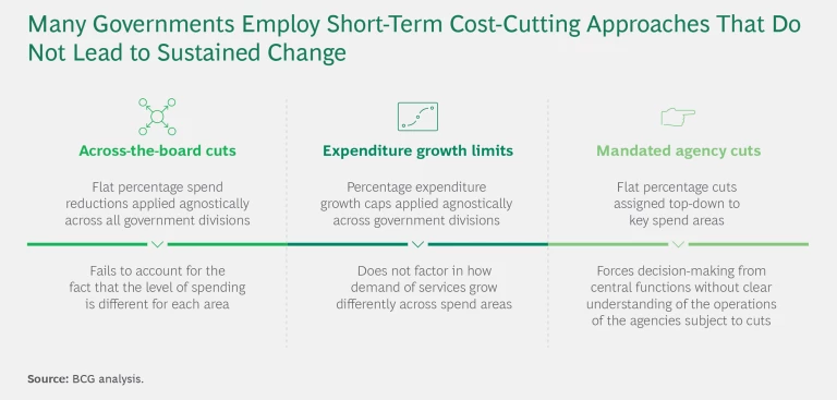 Governments have typically employed three techniques to constrain expenditures: across-the-board cuts; capping cost increases or applying a flat growth line across all areas of spending; and mandated agency reductions. (See “Three Spending Missteps.”)