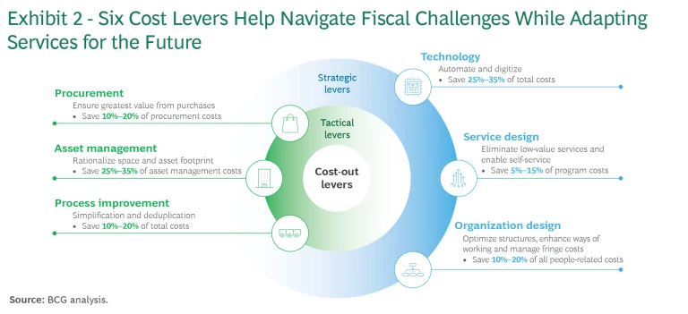 Service Design. Redesigning service delivery allows governments to achieve the same outcomes while saving 5% to 15% of program costs on average. This can be done even while reforming services to be more resilient in the face of changing demographics (including aging and migrating populations), increased demand for digitization, and future proofing against global risks, such as climate change and political and economic instability.