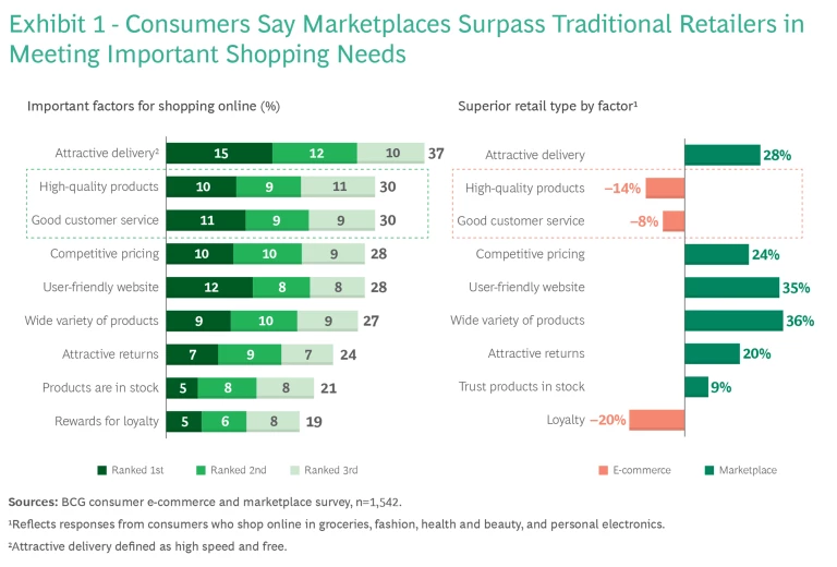 Consumers like marketplaces. According to a BCG survey of more than 1,500 consumers in five countries, marketplaces outperform traditional e-commerce sites in six of the nine aspects that they value the most when shopping online. (See Exhibit 1.)