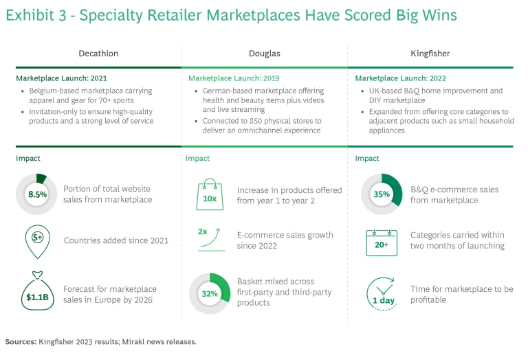 Retailers that have launched specialty marketplaces in the past five years have done well. (See Exhibit 3.) A health and beauty marketplace that Douglas launched in Germany in 2019 contributed to e-commerce sales at the company that have doubled since 2022. A Belgium-based marketplace for sports apparel and gear that Decathlon established in 2021 is forecast to reach the equivalent of $1.1 billion in sales in Europe by 2026. The B&Q UK-based home improvement and DIY marketplace that Kingfisher launched in 2022 was profitable from day one and now accounts for 41% of the company’s total e-commerce sales.