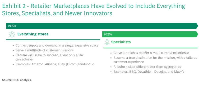 E-commerce B2C marketplaces have changed since the dawn of the first digital-native, everything store-type marketplaces during the dot-com era. (See Exhibit 2.) The scale needed to operate such sites today has led retailers to differentiate themselves by launching marketplaces within niches where they have an established reputation, such as electronics, home improvement, health and beauty, fashion, or sporting goods. Of the consumers we surveyed, 70% prefer shopping on specialized marketplaces over everything stores that have the same products at a similar price because they perceive the customer service and prices to be better and because they have more trust in the brands.