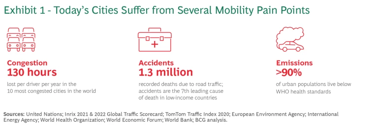 Cities around the world are at a decision point as their mobility ecosystems face unprecedented challenges. (See Exhibit 1.) Among the challenges: