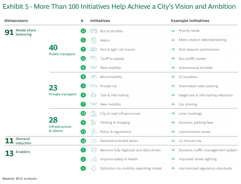 Mapping the Solution Space. BCG relies on a comprehensive list of more than a hundred potential initiatives grouped into three main categories. (See Exhibit 5.) However, not every initiative is equally impactful or suitable for every city. For example, emerging cities might need to focus on establishing basic infrastructure, like a functioning bus network, while more developed ones could explore advanced urban-planning concepts, such as “15-minute cities.” The primary task here is to refine this long list into a short list of the 15 to 20 most effective potential initiatives. This step is crucial to overall success; usually, a handful of initiatives deliver the bulk of the impact. (In a recent case, we found that 5 of 13 private transport initiatives led to more than 95% of the overall reduction in trips.)