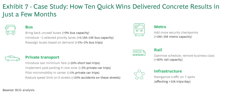 Quick wins are essential for generating early momentum and public support. These can include initiatives like establishing bus priority lanes at key intersections, implementing smarter passenger funneling at metro stations, introducing paid-parking zones, creating pop-up bike lanes, refining schedules, and reorganizing traffic flows. (See Exhibit 7.) These measures improve the efficiency and appeal of public and active transport options and demonstrate the authority’s commitment to real change.