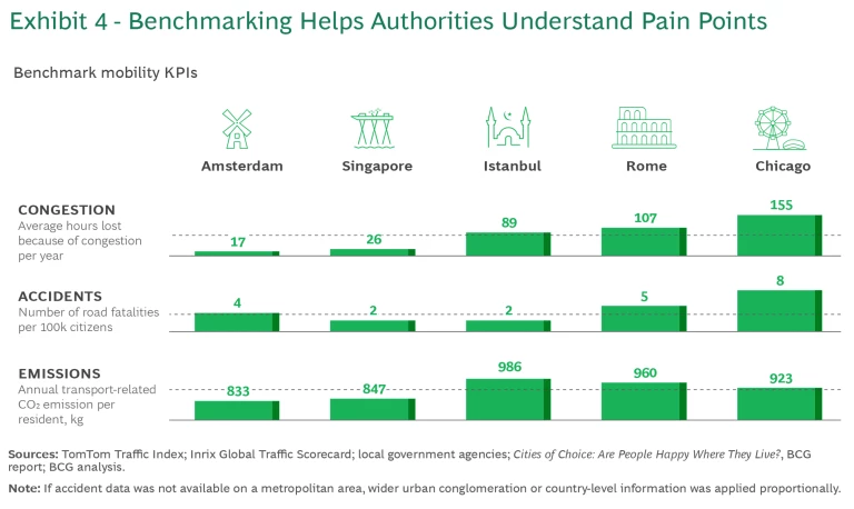 Besides the modal share, key metrics such as levels of congestion, accidents, and emissions are required to set the right baseline. (See Exhibit 4.) For example, Amsterdam is a role model with respect to congestion efficiency (only 17 hours lost to congestion versus, for example, more than 100 in Rome) but could still improve on safety (approximately four deaths per 100,000 inhabitants