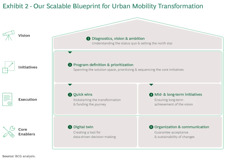 Vision and Ambition (“to Be”). To effectively address current challenges in a city’s mobility system, officials need to establish a clear vision and ambition that serve as a north star for decisions and actions. To ensure that the vision and ambition are both actionable and impactful, officials should meet essential criteria, including: