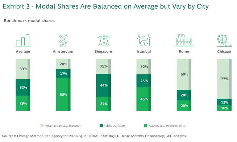 However, these shares vary greatly depending on the city type and the city’s current development and transformation stage. For example, in the US, private transport often accounts for more than 70% of modal share (in Chicago, for example), whereas in many Asian cities (such as Tokyo and Singapore), public transport plays a far more critical role, with shares ranging from 47% to 53%.