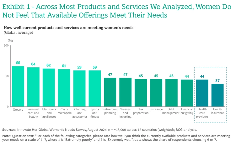 Here’s something many CEOs don’t know but most women do: companies consistently fail to offer products and services that meet women’s needs. This means that companies are missing a meaningful opportunity. A global BCG X survey, supported by BCG’s expert Center for Customer Insights, of approximately 15,000 people in 12 countries, of whom about three-fourths were women, found that in key segments such as consumer goods, health care, and financial services, women do not believe that the products and services available to them readily meet their needs. (See “Methodology.”)