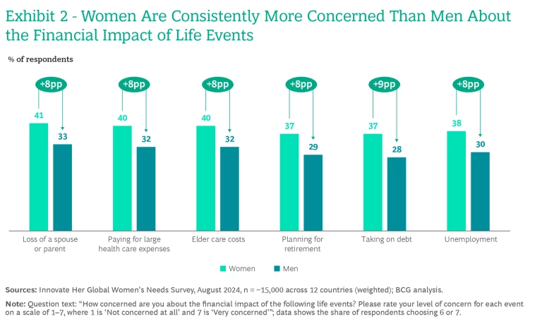 On average, women are more concerned than men about the financial impact of major life events, like debt (a difference of 9 percentage points) and planning for retirement (8 points). These worries evolve across life stages. For example, Gen Z and millennial women rank unemployment as their top concern. For Gen X women, planning for retirement is higher on their list, while baby boomers cite elder care costs as their biggest worry. However, at most stages, women are more concerned than men. (See Exhibit 2.)