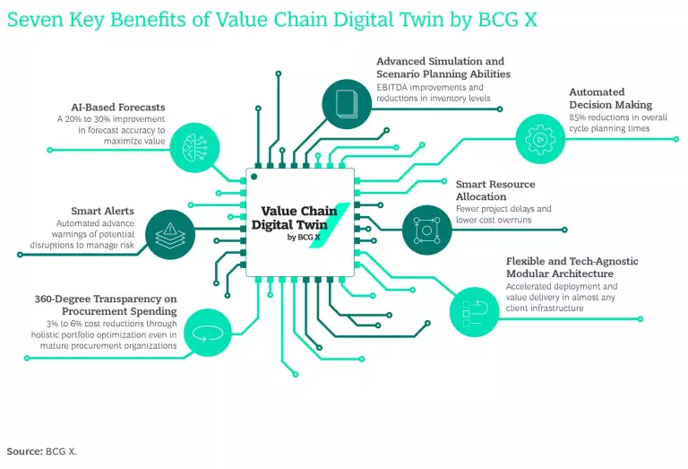 - AI-based, probabilistic forecasts help companies improve planning accuracy, mitigate risk, and assess the impact of disruptions on their supply chains. Value Chain Digital Twin by BCG X provides the ability to combine internal data such as historical demand patterns, supply performance, inventory draws, and short-term consumption changes with external data including industry indices, port utilization, and shipping volumes. By deploying advanced AI on these interdependent factors, companies can automatically forecast demand and analyze supply patterns at higher accuracy as well as to identify risks weeks and months in advance. Early adopters of Value Chain Digital Twin have seen benefits such as 20% to 30% improvement in forecast accuracy, full coverage of the long tail in planning, and 50% to 80% reductions in delays and downtime.