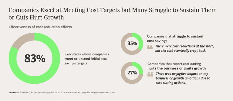 Cost initiatives may start strong but run into trouble. The vast majority of corporate leaders we surveyed said their cost programs meet or exceed initial savings targets. However, a substantial portion struggle to sustain reductions. Others report that cost cuts hurt business or limit growth.