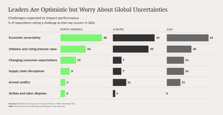 Corporate leaders aren’t entirely upbeat. They remain concerned about the possible business challenges posed by inflation, rising interest rates, and the potential for recession. They’re also tracking socioeconomic and geopolitical fallout from this year’s general elections in the US, India, and EU and from ongoing conflicts in Ukraine and the Middle East.