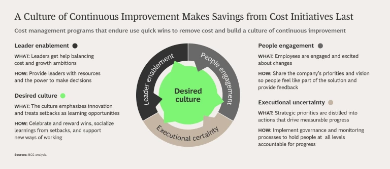 Companies can unlock resources through quick wins and reinvest them in areas that drive growth, such as digital and AI, talent advancement, modernized supply chains, and operational excellence. To support change, top leaders must build a culture that supports it. They can do that by engaging people, translating strategies into measurable actions, treating setbacks as opportunities to learn, and provide other leaders in the organization with the support and resources they need to balance cost and growth goals.