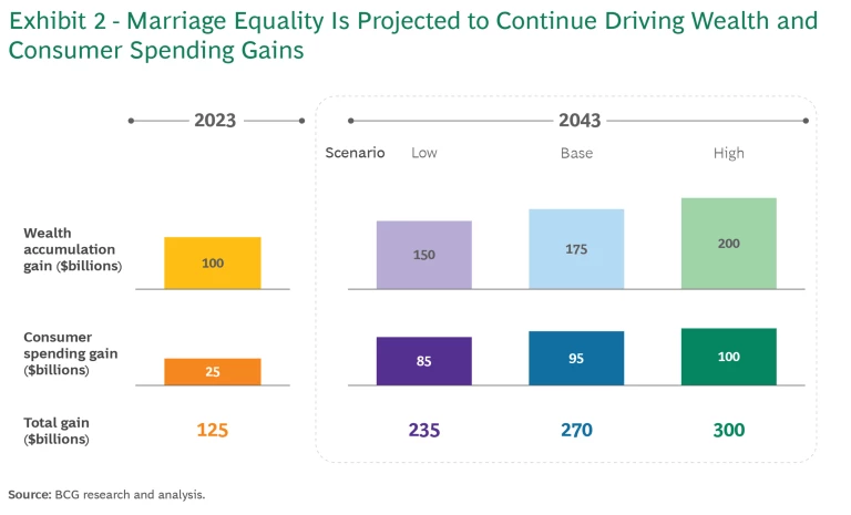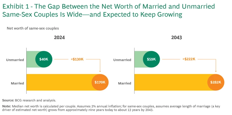 This would translate to approximately $100 billion in wealth accumulation for same-sex couples who are married today and an additional $150 billion to $200 billion by 2043.