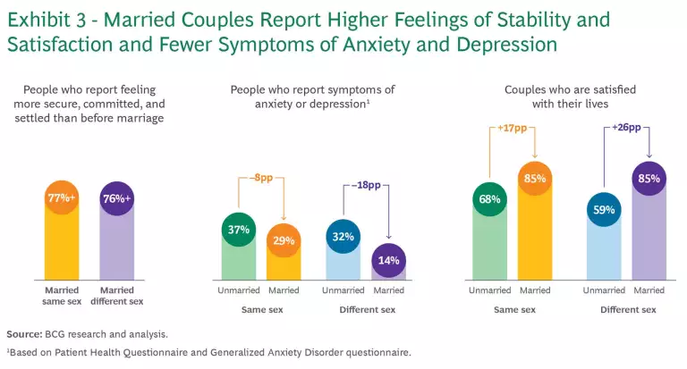 Previous studies have shown that the nonfinancial impact of marriage on different-sex couples is powerful, with married people reporting greater satisfaction in their lives and better mental