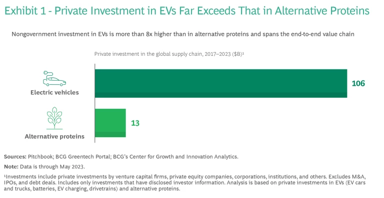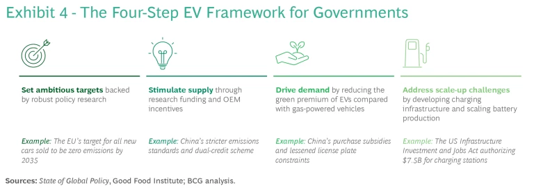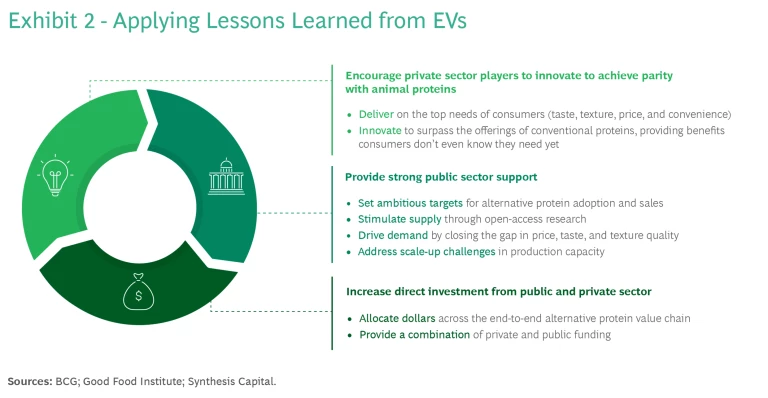 And to successfully expand this sector, governments and alternative protein companies should learn from the lessons that jump-started the growth of the EV industry. (See Exhibit 2.)