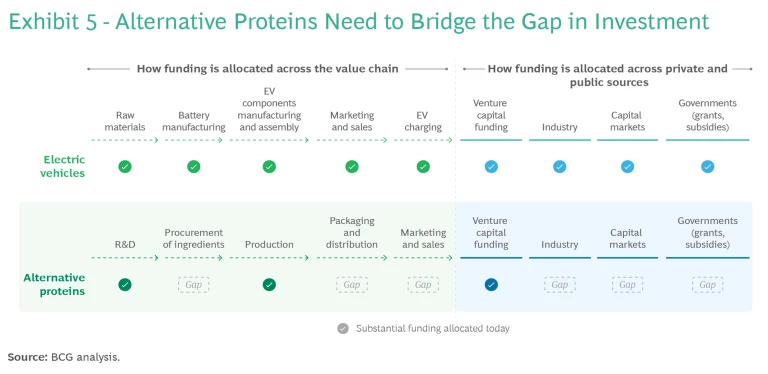 Public and private EV funding is allocated across the end-to-end value chain—from raw material mining to EV charging. By comparison, the funding landscape for alternative proteins is characterized by investment whitespace. (See Exhibit 5.) Still, as alternative protein companies seek to secure funding, they can apply lessons learned from the earlier experience of the EV industry.