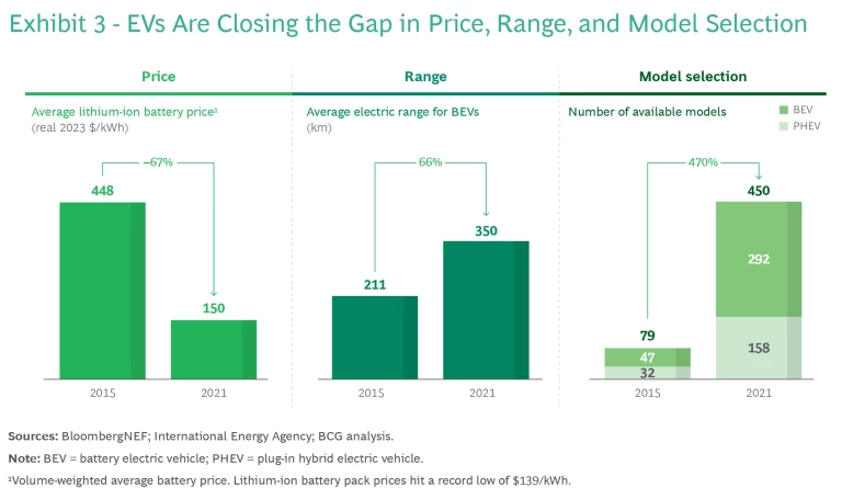 To compete with gas-powered vehicles, EV makers have used the public and private investments they received to innovate on vehicle quality and cost. Over time, they’ve significantly closed the gap with traditional vehicles on price, range, and model selection. (See Exhibit 3.) What’s more, they have delivered capabilities that traditional autos lacked, including cutting-edge operating systems and superior acceleration. Suddenly, sustainability is no longer a tradeoff—but a bonus.