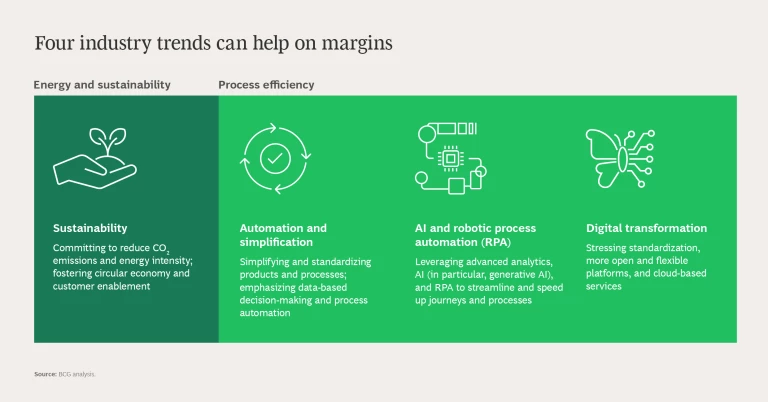 This year’s telco IT benchmark (TeBIT) study, jointly developed by ETIS—The Community for Telecom Professionals—and Boston Consulting Group, reveals that two of the most promising levers are in plain sight: sustainability and process efficiency. The survey, conducted in November 2023 and covering European operators’ IT spending and performance, finds that both are already high priorities. By reducing energy consumption, sustainability programs can reduce energy costs. By cutting process waste—creating faster, leaner, more automated journeys—efficiency projects can also cut costs. When done well, these initiatives help telcos optimize margins while delivering dividends for customers and society.